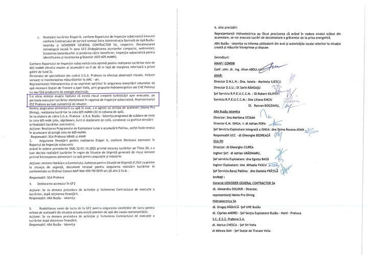 Există însă o minută semnată pe 22 octombrie în care se consemnează un risc tehnic previzibil și există obligații operaționale ale ESZ Prahova de ani de zile, care spun clar că operatorul era cel ce trebuia să mențină rezerve de apă și să avertizeze dacă stația Voila nu poate face față. Niciuna dintre aceste obligații nu a fost respectată. Și, mai grav, nimeni din ESZ nu a spus vreodată, în scris, că o ploaie serioasă ar putea lăsa 100.000 de oameni fără apă la robinet.
