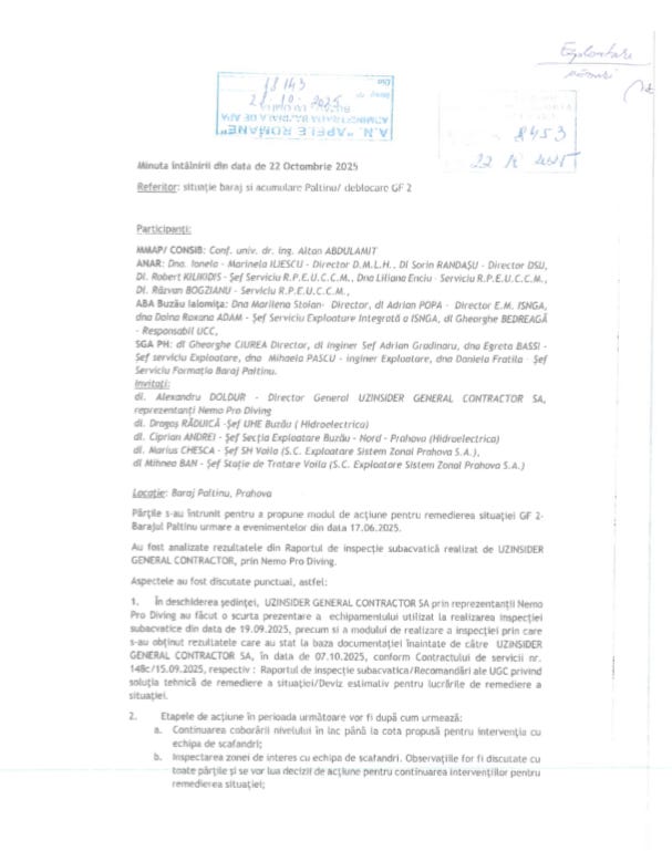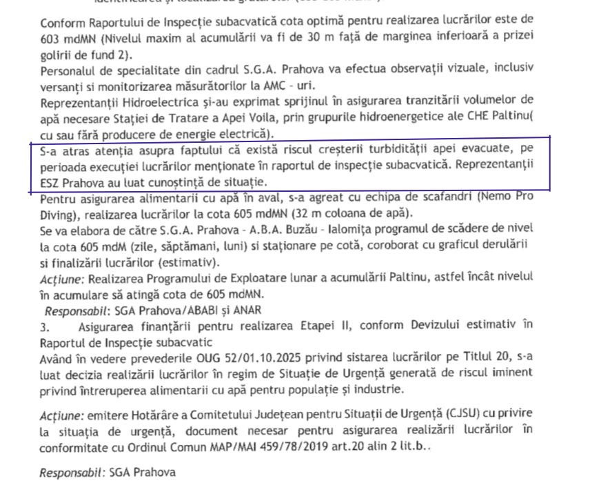 Deși autoritățile par acum luate prin surprindere, documentele arată contrariul. Un raport de inspecție semnat pe 22 octombrie și înregistrat oficial pe 29 octombrie demonstrează că atât Apele Române (administratorul barajului), cât și Exploatarea Sistemului Zonal (ESZ) Prahova (operatorul care livrează apa) știau de „riscul creșterii turbidității”.