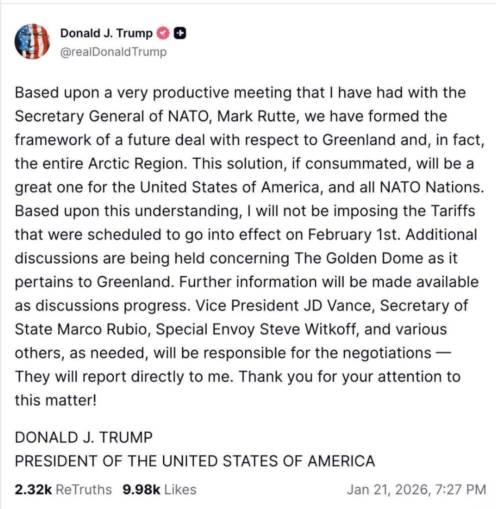 Asta a fost prima dovadă clară că strategia de intimidare a eșuat și că se căuta o ieșire onorabilă din criză, care a venit câteva ore mai târziu, după ce a discutat cu Mark Rutte, Secretarul General al NATO. Trump a anunțat apoi, într-un mesaj pe platforma sa Truth Social, că a avut o întâlnire „foarte productivă” și că a stabilit cadrul unui viitor acord.