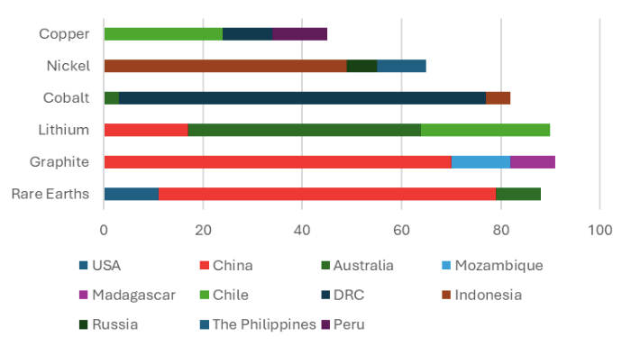 Grafitul, a cărei procesare este dominată de China, este utilizat pentru materiale refractare. O subcategorie a mineralelor critice este reprezentată de elementele pământurilor rare (REE), precum neodim, praseodim, dispriu, terbiu.