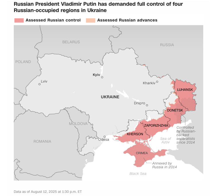 Dar Trump a renunțat brusc la acest principiu, părând mai degrabă să adopte planul lui Putin, care prevede cedarea întregului Donbas către Rusia în schimbul unui armistițiu pe liniile actuale ale frontului și a unei promisiuni scrise că Rusia nu va mai ataca Ucraina sau Europa.