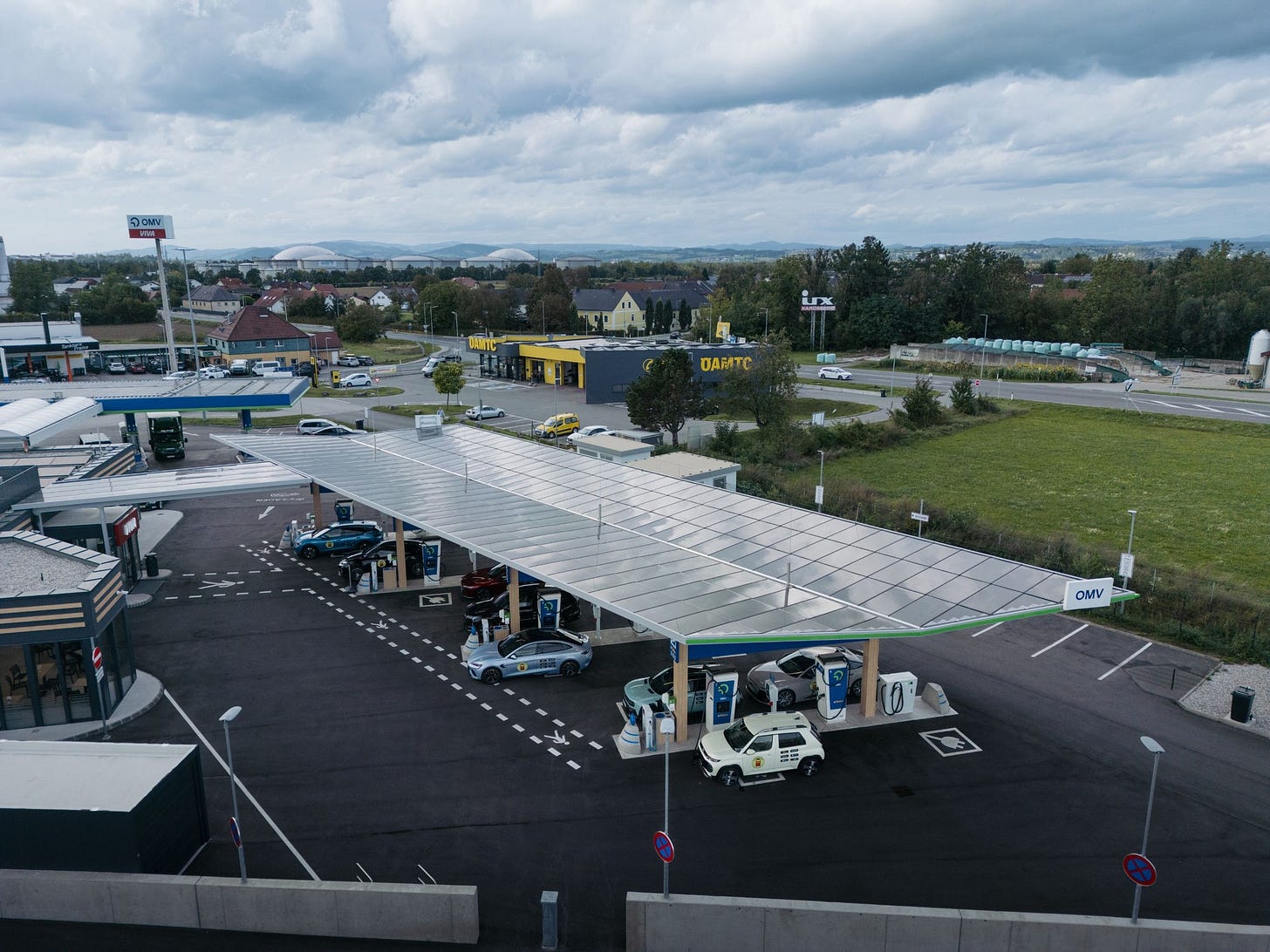 În Austria, la OMV-ul din Sankt Valentin, nu foarte departe de Linz, am dat peste un punct mare de încărcare cu 16 stații, integrat într-o benzinărie obișnuită, cu zonă de cafea și fresh food.