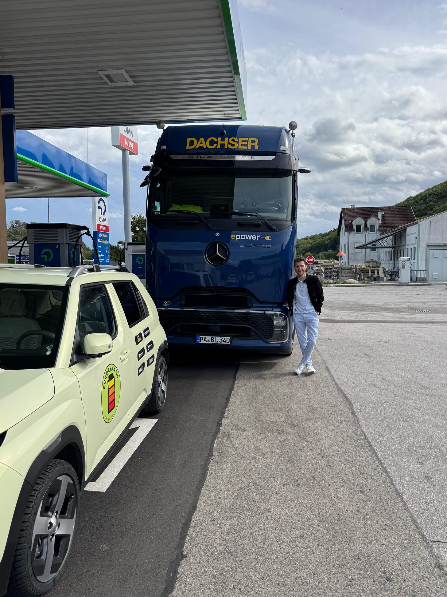 La Alland, într-o altă stație OMV, am dat de supriza zilei, un șofer român pe nume Vasile, care conduce un cap tractor electric cu care face curse interne în Austria. L-am întrebat cum e experiența de a conduce un camion electric.