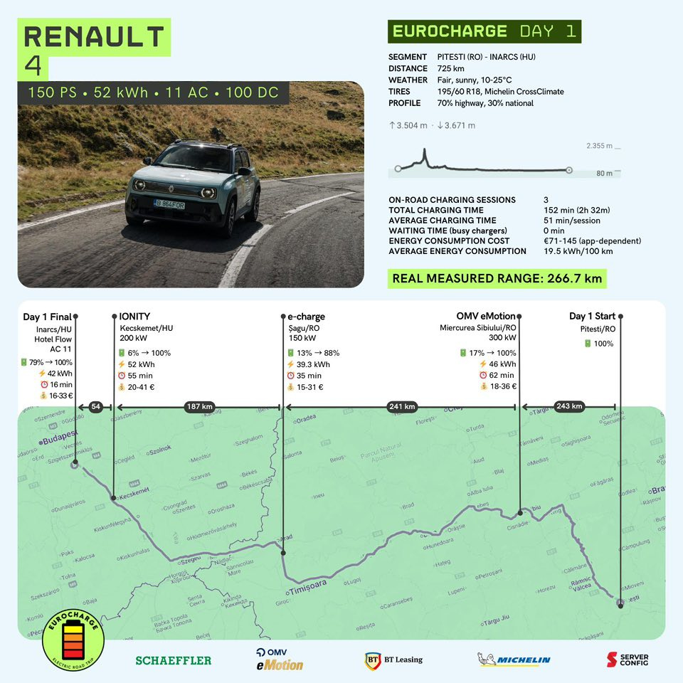 Și ca să vedeți cum s-au desfășurat lucrurile, vă las mai jos și fișa tehnică a primei zile din EUROCHARGE by Schaeffler, în care am condus Renault 4 aproape 267 de km cu o singură încărcare completă.