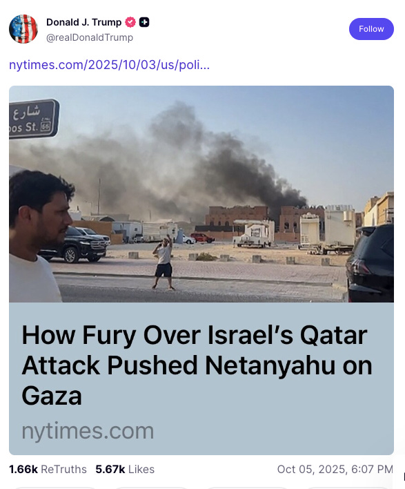 Dar distribuirea articolului care descrie cum furia provocată de atacul eșuat al Israelului asupra Qatarului l-a împins pe președintele SUA să-l preseze pe Netanyahu arată că Trump nu mai are răbdare cu el și vrea să marcheze public distanțarea. Iar acest lucru a fost consemnat și de presa israeliană.