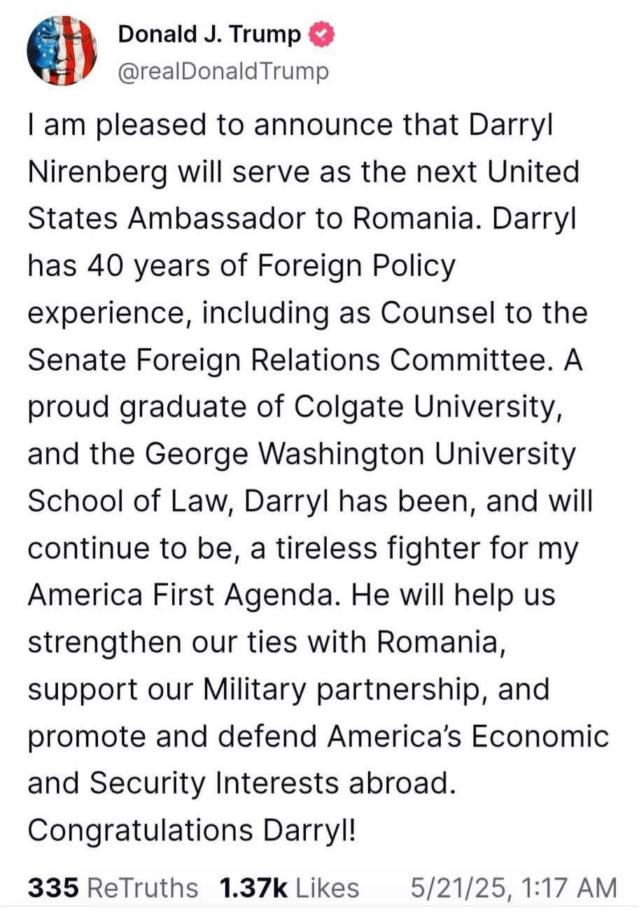 Târziu în noapte, Trump a anunțat că noul ambasador la București va fi republicanul Darryl Nirenberg, fost consilier al comisiei pentru relații externe a Senatului SUA.