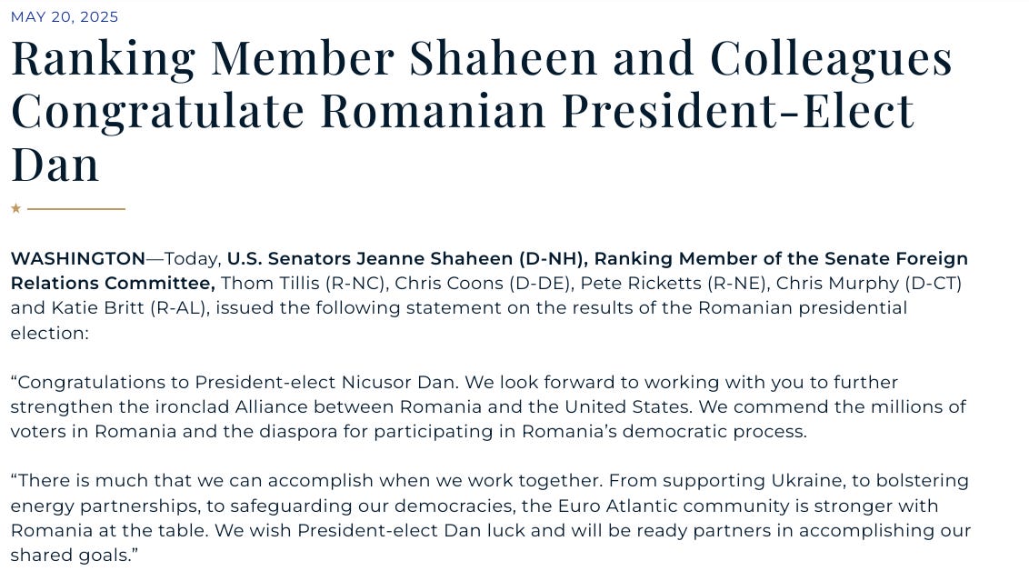 Șase senatori republicani și democrați din comisia pentru relații externe a camerei superioare a Congresului american l-au felicitat pe Nicușor Dan pentru câștigarea alegerilor prezidențiale din România. Acesta este primul mesaj oficial de felicitări din SUA pentru Nicușor Dan, venit după mesajul transmis de ambasada de la București.