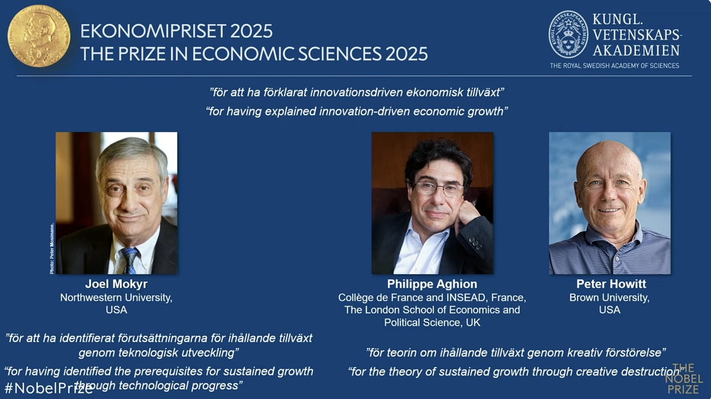 Premiul Nobel pentru Economie din 2025 a fost acordat lui Joel Mokyr, Philippe Aghion și Peter Howitt pentru contribuțiile lor fundamentale la explicarea creșterii economice bazate pe inovație, în special prin aprofundarea conceptului de „distrugere creatoare”.