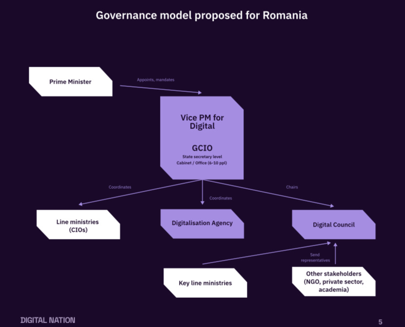 - Aici intră formarea unei echipe de 6-10 experți în politici digitale, arhitectură guvernamentală și service design. Responsabilitățile lor principale ar include: dezvoltă strategia națională de transformare digitală, stabilește standarde tehnice și de servicii, coordonează CIO-ii ministeriali, face „digital check” obligatoriu pentru toată legislația și se ocupă de secretariatul Consiliului Digital.Înființarea unui Consiliul Digital, prezidat de Vicepremier