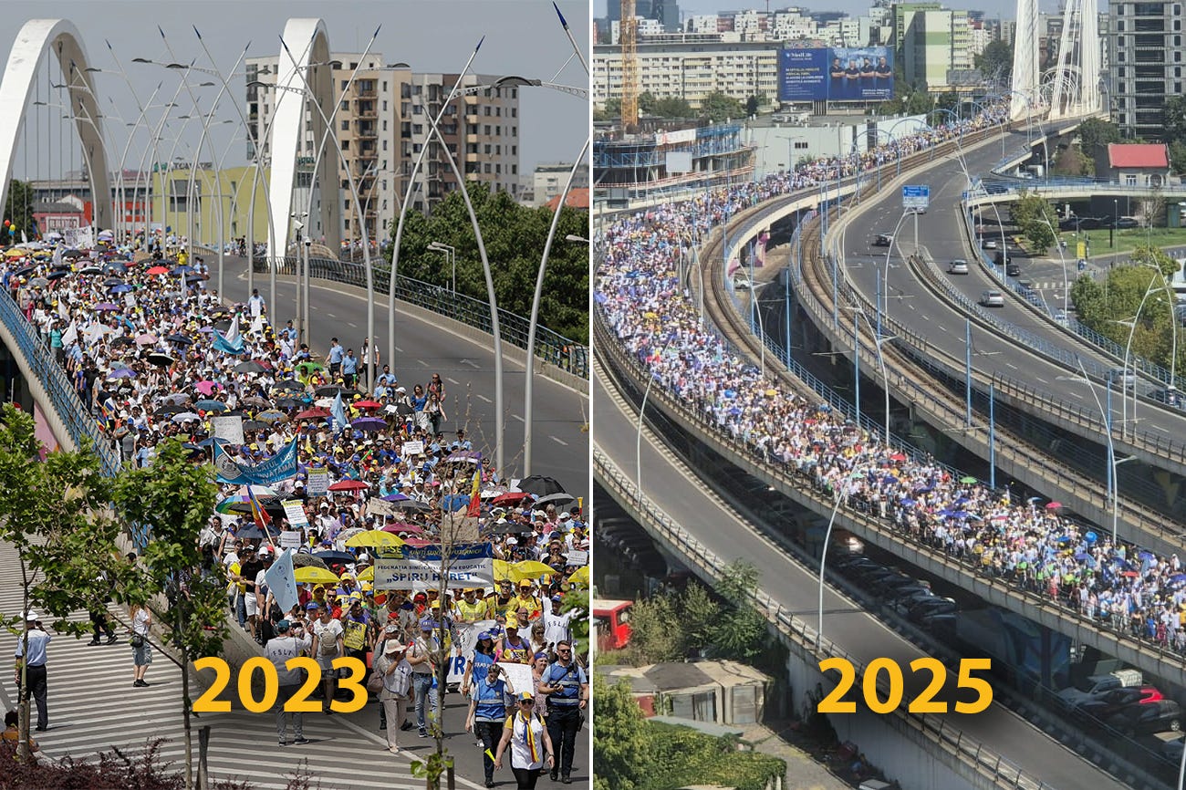 Și dacă tot am avut poză de pe pasajul Basarab, fix ca acum doi ani, de la celebrul protest din 22 mai 2023 care a declanșat atunci o grevă generală în sistemul de învățământ din România, să fim puțin atenți la minge.