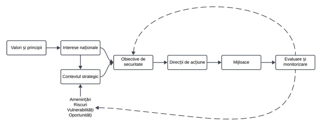 Așadar, analizarea contextului strategic și determinarea principalelor amenințări, riscuri și vulnerabilități trebuie să se facă prin prisma intereselor naționale. Iar interacțiunea dintre interesele naționale și contextul strategic determină, așa cum se poate vedea și în graficul de mai sus, obiectivele de securitate națională. Aceste obiective nu pot fi derivate doar din interesele naționale, așa cum par să creadă cei care au redactat strategiile din 2015 și 2020, ci din interacțiunea acestor interese cu contextul strategic.